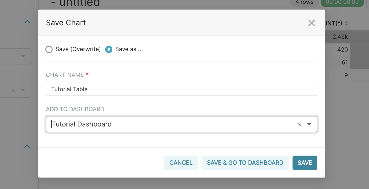 - Select Add To Dashboard and enter Tutorial Dashboard. Finally, select Save & Go To Dashboard.